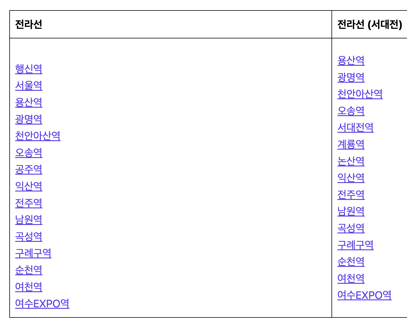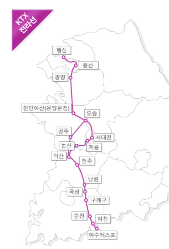 2022년 12월 09일 노선도 KTX 전라선 노선도 조회하기 시간표 전라선 전라선 (서대전) 행신역서울역용산역광명역천안아산역오송역공주역익산역전주역남원역곡성역구례구역순천역여천역여수EXPO