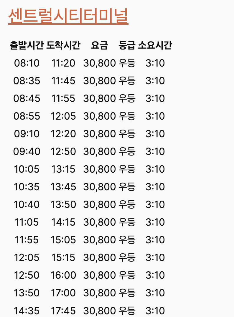 - **요금:** 13,300원 (고속), 19,400원 (우등), 25,200원 (프리미엄)