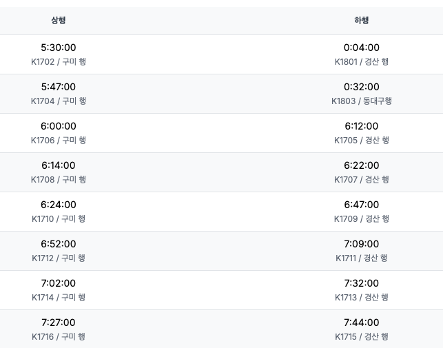 | 구미역 대경선 시간표 조회 - 평일 주말 첫차 막차 시간 (0) | 2025.06.12 |